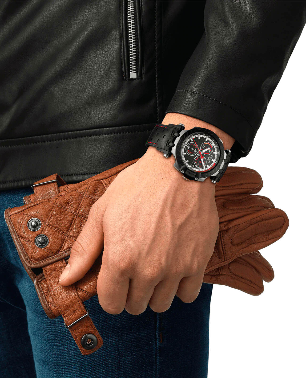 Аксессуар Limited Edition стал отражением скоростной стилистики. Динамичное оформление с мотогоночным дизайном позволит выгодно подчеркнуть повседневный образ. Массивный безельБезельВнешний ободок, закрепляющий стекло. В спортивных часах так называется поворотное кольцо с делениями на циферблате, выполняет роль таймера – замеряет отрезки времени на шкале. Неподвижный безель – элемент декора. Однонаправленно вращающийся безель на дайверских часах позволяет фиксировать моменты погружения и выныривания на поверхность. стилизован под шину мотоцикла, фактурный циферблат с красными акцентами добавляет спортивности. Задняя крышка дополнена узнаваемой гравировкой. Часы – чемпионы не только на трассе, но и в измерении времени. Высокую точность хода обеспечивает швейцарский кварцевый калибр ETA G10.212. Стекло из сапфира с покрытием "антиблик". Перфорированный каучуковый ремешок с кожаной текстурой. Люминесцентная подсветкаЛюминесцентное покрытиеПозволяет считывать показания времени в темноте. Производители наносят на стрелки, часовые индексы, безель или поверхность циферблата светонакопительный состав, дающий холодное свечение.. Корпус из стали 316L с черным PVD-покрытиемPVDУльтратонкое покрытие наносится в технике вакуумного напыления, сочетает в себе нитрид титана особой прочности со слоем золота или оксида хрома. Несёт в себе декоративную или защитную функцию.. Водостойкость 100 метров. Секундомер, тахиметрТахиметрРазмеченная шкала, располагается на ободке или безеле часов. Тахиметр позволяет рассчитать скорость на определённом участке пути, расстояние измеряется в километрах или милях., индикация числа, хронографХронографФункция позволяет измерять отрезки времени с особой точностью: часы, минуты, секунды. Верным признаком хронографа является наличие на циферблате 3 дополнительных окошек-счётчиков.. Габариты: 47,6 x 43 x 12,71 мм.