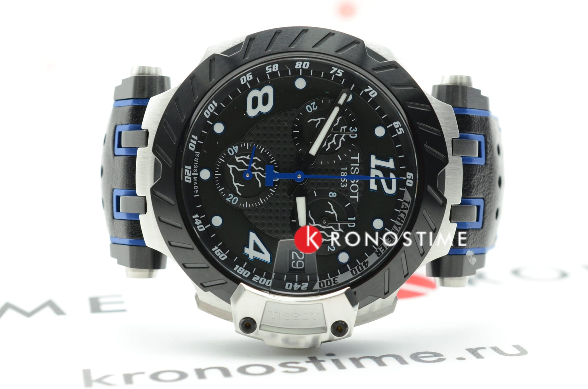 Задняя крышка имеет гравировку - номер "12", под которым выступает знаменитый спортсмен. Броская модель с оригинальным исполнением циферблата станет отличительной деталью вашего образа, динамичности придают синие элементы. Всё напоминает о гоночных мотоциклах. Необычный безельБезельВнешний ободок, закрепляющий стекло. В спортивных часах так называется поворотное кольцо с делениями на циферблате, выполняет роль таймера – замеряет отрезки времени на шкале. Неподвижный безель – элемент декора. Однонаправленно вращающийся безель на дайверских часах позволяет фиксировать моменты погружения и выныривания на поверхность. имитирует тормозной диск, счётчики хронографаХронографФункция позволяет измерять отрезки времени с особой точностью: часы, минуты, секунды. Верным признаком хронографа является наличие на циферблате 3 дополнительных окошек-счётчиков. сделаны под приборную панель, узор ремешка навевает мысли о протекторе шины. Высокую точность хода обеспечивает кварцевый калибр ETA G10.212. Сапфировое стекло с антибликовым покрытием. Чёрное PVD-покрытиеPVDУльтратонкое покрытие наносится в технике вакуумного напыления, сочетает в себе нитрид титана особой прочности со слоем золота или оксида хрома. Несёт в себе декоративную или защитную функцию.. Люминесцентная подсветкаЛюминесцентное покрытиеПозволяет считывать показания времени в темноте. Производители наносят на стрелки, часовые индексы, безель или поверхность циферблата светонакопительный состав, дающий холодное свечение.. Водонепроницаемость 100 метров. Секундомер, тахиметрТахиметрРазмеченная шкала, располагается на ободке или безеле часов. Тахиметр позволяет рассчитать скорость на определённом участке пути, расстояние измеряется в километрах или милях., отображение даты. Эксклюзивная упаковка в виде шлема. Габариты: 47,6 x 43 x 12,3 мм.