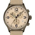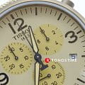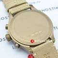 Модель выполнена в лаконичном бежевом цвете, исключение составляет PVD-покрытиеPVDУльтратонкое покрытие наносится в технике вакуумного напыления, сочетает в себе нитрид титана особой прочности со слоем золота или оксида хрома. Несёт в себе декоративную или защитную функцию. корпуса оттенка хаки. Циферблат дополнен арабскими цифрами и миниатюрными счётчиками хронографа. Тканевый ремешок красиво смотрится на запястье, материал обеспечивает комфортное ношение. Высокоточный кварцевый механизм ETA G10.212. Водонепроницаемость при давлении 10 бар. Люминесцентная подсветкаЛюминесцентное покрытиеПозволяет считывать показания времени в темноте. Производители наносят на стрелки, часовые индексы, безель или поверхность циферблата светонакопительный состав, дающий холодное свечение. стрелок. ХронографХронографФункция позволяет измерять отрезки времени с особой точностью: часы, минуты, секунды. Верным признаком хронографа является наличие на циферблате 3 дополнительных окошек-счётчиков., секундомер, отображение текущего числа. Габариты: 45 x 45 x 11 мм.