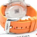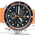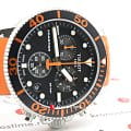 Наручные часы отличаются спортивным дизайном, прослеживается дайверская тематика, чему способствует и водонепроницаемость при давлении 30 бар на глубине 300 метров. Цветовая гамма сдержанная, но оттенки играют благодаря чёрному PVD-покрытиюPVDУльтратонкое покрытие наносится в технике вакуумного напыления, сочетает в себе нитрид титана особой прочности со слоем золота или оксида хрома. Несёт в себе декоративную или защитную функцию. безеляБезельВнешний ободок, закрепляющий стекло. В спортивных часах так называется поворотное кольцо с делениями на циферблате, выполняет роль таймера – замеряет отрезки времени на шкале. Неподвижный безель – элемент декора. Однонаправленно вращающийся безель на дайверских часах позволяет фиксировать моменты погружения и выныривания на поверхность. и серебристому корпусу. Кварцевый механизм ETA G10.212. Сапфировое стекло с антибликовым покрытием. Завинчивающаяся заводная головка и задняя крышка. Люминесцентная подсветкаЛюминесцентное покрытиеПозволяет считывать показания времени в темноте. Производители наносят на стрелки, часовые индексы, безель или поверхность циферблата светонакопительный состав, дающий холодное свечение.. Оранжевый каучуковый ремешок. Секундомер, хронографХронографФункция позволяет измерять отрезки времени с особой точностью: часы, минуты, секунды. Верным признаком хронографа является наличие на циферблате 3 дополнительных окошек-счётчиков., календарь. Габариты: 45 x 45 x 12,8 мм.