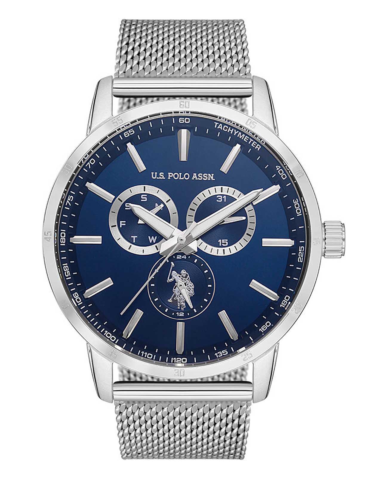 Мужские часы с тахиметромТахиметрРазмеченная шкала, располагается на ободке или безеле часов. Тахиметр позволяет рассчитать скорость на определённом участке пути, расстояние измеряется в километрах или милях. U.S. Polo Assn Fundamental USPA1075-02, кварцевый механизм с высокой точностью. Минеральное стеклоМинеральное стеклоМинеральное стекло представляет собой искусственно выращенный минерал кварца. Такое стекло отличается особой устойчивостью к повреждениям и царапинам. Уступает по некоторым качествам сапфировому стеклу. устойчивое к появлению царапин, обладающее высокой прозрачностью. Корпус изготовлен из нержавеющей стали. Центральные часовая, минутная и секундная стрелки. 24-х часовой формат времени, окошко даты и дня недели вынесены на отдельный циферблат. Стрелки с люминесцентным покрытиемЛюминесцентное покрытиеПозволяет считывать показания времени в темноте. Производители наносят на стрелки, часовые индексы, безель или поверхность циферблата светонакопительный состав, дающий холодное свечение.. Класс водозащиты: 50 метров, позволит защитить корпус от случайных брызг или капель дождя. Стальной браслет миланского плетения на раскладном замкеРаскладной замокДанный вариант застежки используется только на часах с металлическим браслетом. Отличительная особенность такого крепления в том, что длина браслета становится универсальной и вы можете самостоятельно отрегулировать нужный вам размер – застежка просто двигается по браслету часов..