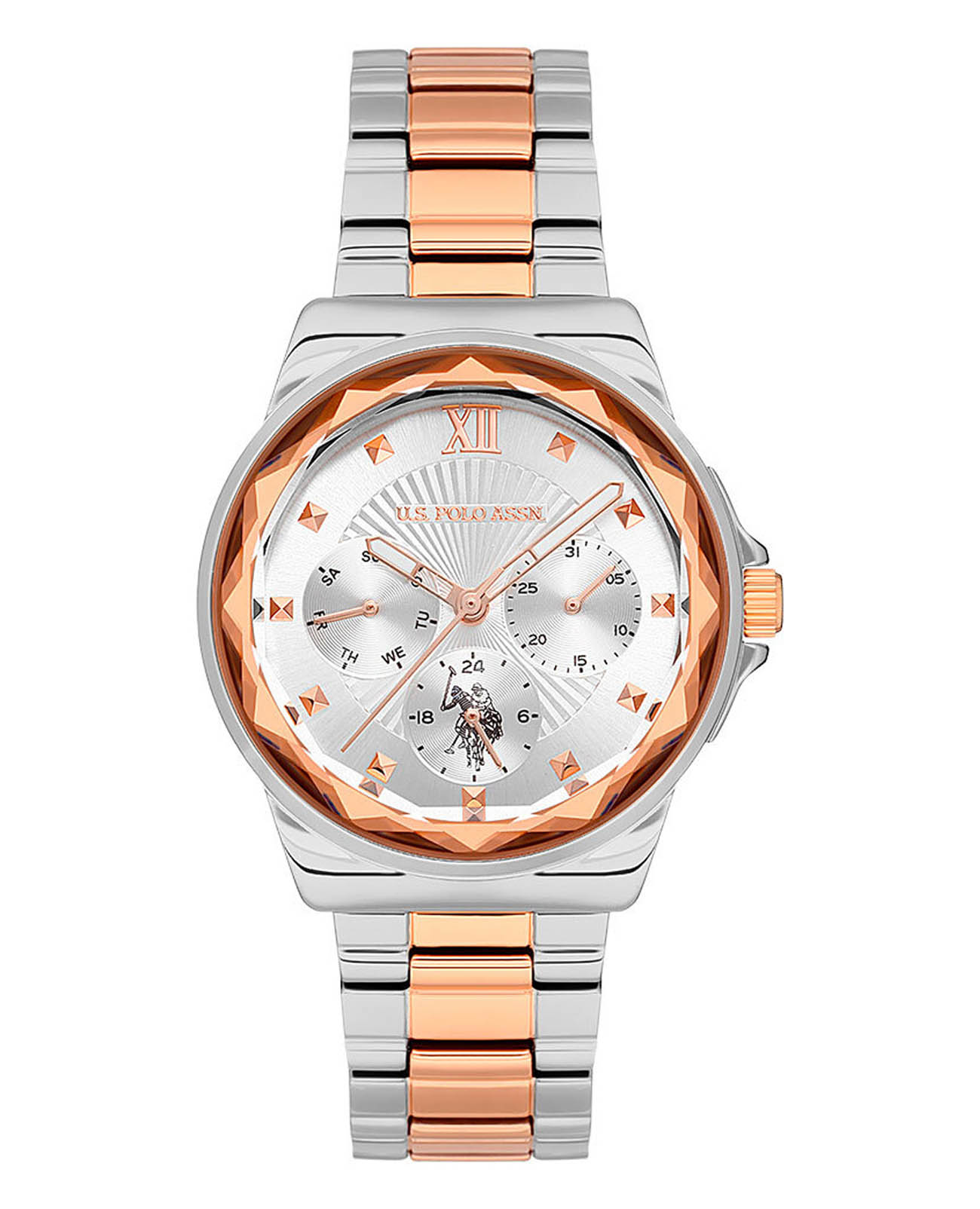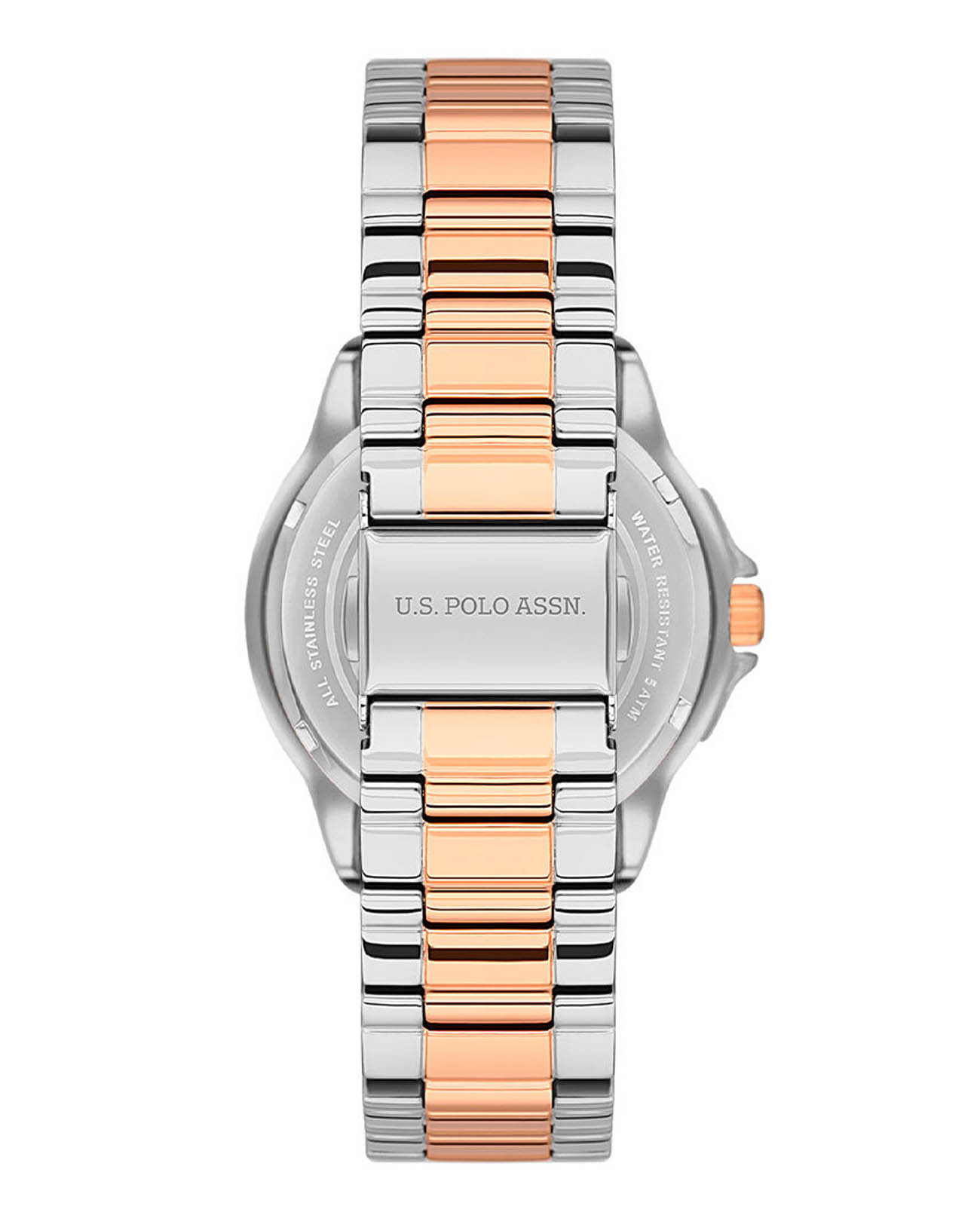 Женские часы U.S. Polo Assn Stile USPA2065-04, кварцевый механизм с высокой точностью. Минеральное стеклоМинеральное стеклоМинеральное стекло представляет собой искусственно выращенный минерал кварца. Такое стекло отличается особой устойчивостью к повреждениям и царапинам. Уступает по некоторым качествам сапфировому стеклу. устойчивое к появлению царапин, обладающее высокой прозрачностью. Корпус изготовлен из нержавеющей стали. БезельБезельВнешний ободок, закрепляющий стекло. В спортивных часах так называется поворотное кольцо с делениями на циферблате, выполняет роль таймера – замеряет отрезки времени на шкале. Неподвижный безель – элемент декора. Однонаправленно вращающийся безель на дайверских часах позволяет фиксировать моменты погружения и выныривания на поверхность. с IP-покрытиемIP-покрытиеМетод ионного напыления. Демонстрирует повышенную устойчивость к истиранию, окислению и химическим веществам. Под воздействием высокого давления и температуры около 1500°C молекулы металла надёжно соединяются с частицами корпуса часов.. Стрелки с люминесцентным покрытиемЛюминесцентное покрытиеПозволяет считывать показания времени в темноте. Производители наносят на стрелки, часовые индексы, безель или поверхность циферблата светонакопительный состав, дающий холодное свечение..  12/24х часовой формат времени. Класс водозащиты: 50 метров, позволит защитить корпус от случайных брызг или капель дождя. Стальной браслет с частичным IP-покрытиемIP-покрытиеМетод ионного напыления. Демонстрирует повышенную устойчивость к истиранию, окислению и химическим веществам. Под воздействием высокого давления и температуры около 1500°C молекулы металла надёжно соединяются с частицами корпуса часов. на раскладной застёжкеРаскладная застёжкаТакой тип застёжки используется только на браслетах из металла. Она никогда не раскрывается полностью, происходит разделение на 2 и более частей. Раскладывающая застёжка снизит вероятность потери часов к минимуму..