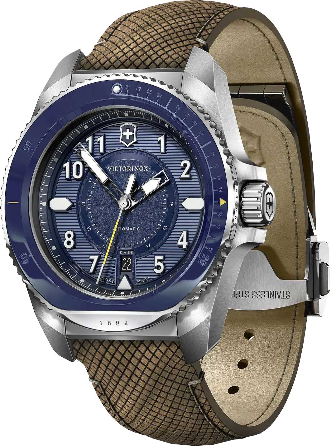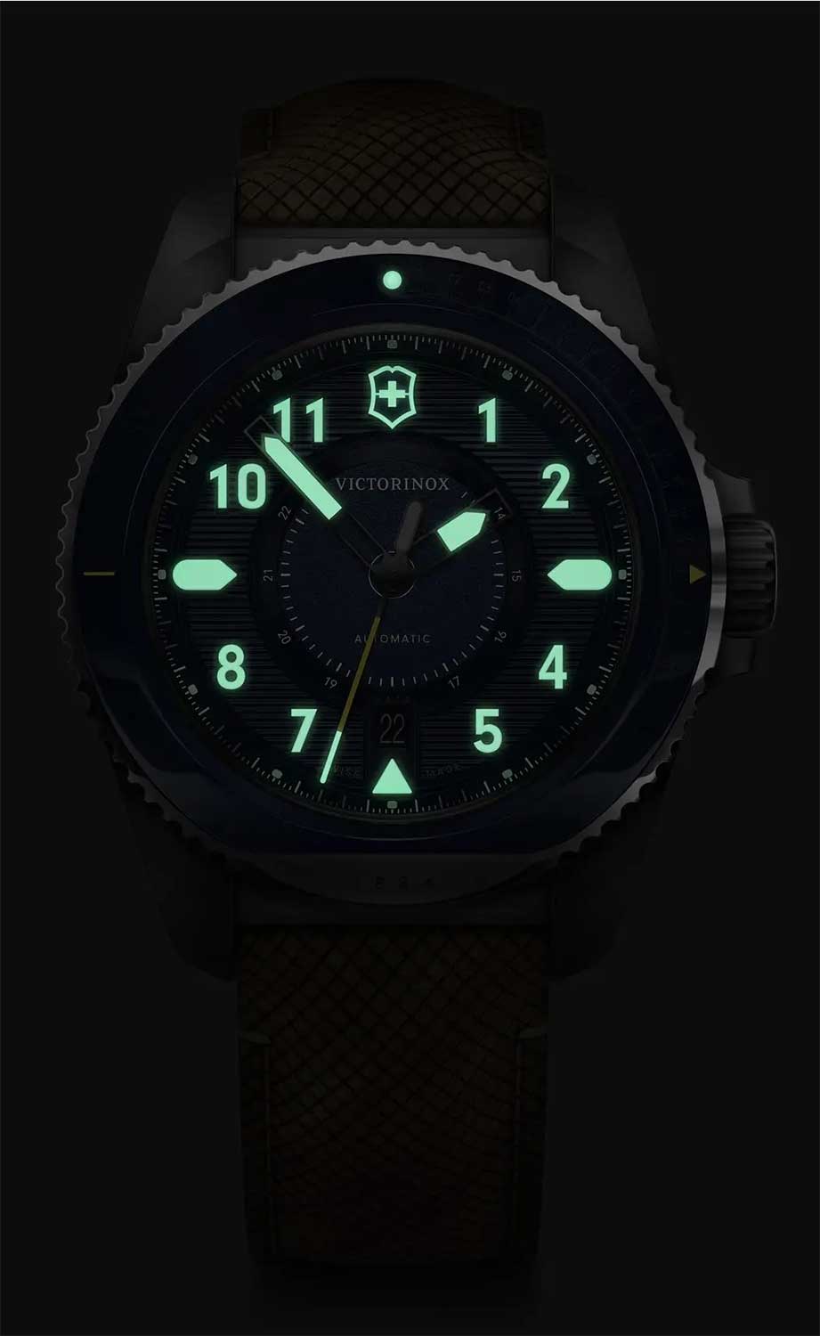 Мужские швейцарские часы Victorinox 241980.1. Сапфировое стеклоСапфировое стеклоПрочный и надёжный материал из кристалла сапфира синтетического происхождения, характеризующийся особой твёрдостью и устойчивостью к царапинам и повреждениям. с трёхслойным антибликовым покрытием. Корпус часов выполнен из титана. Влагозащита: 200 метров, позволит плавать, нырять и заниматься другими водными видами спорта. Стрелки и метки с люминесцентным покрытиемЛюминесцентное покрытиеПозволяет считывать показания времени в темноте. Производители наносят на стрелки, часовые индексы, безель или поверхность циферблата светонакопительный состав, дающий холодное свечение.. В комплекте съемный защитный бампер. В комплекте сменный силиконовый ремешок. Окошко даты находится в положении 6 часов. БезельБезельВнешний ободок, закрепляющий стекло. В спортивных часах так называется поворотное кольцо с делениями на циферблате, выполняет роль таймера – замеряет отрезки времени на шкале. Неподвижный безель – элемент декора. Однонаправленно вращающийся безель на дайверских часах позволяет фиксировать моменты погружения и выныривания на поверхность. с PVD-покрытиемPVDУльтратонкое покрытие наносится в технике вакуумного напыления, сочетает в себе нитрид титана особой прочности со слоем золота или оксида хрома. Несёт в себе декоративную или защитную функцию..
